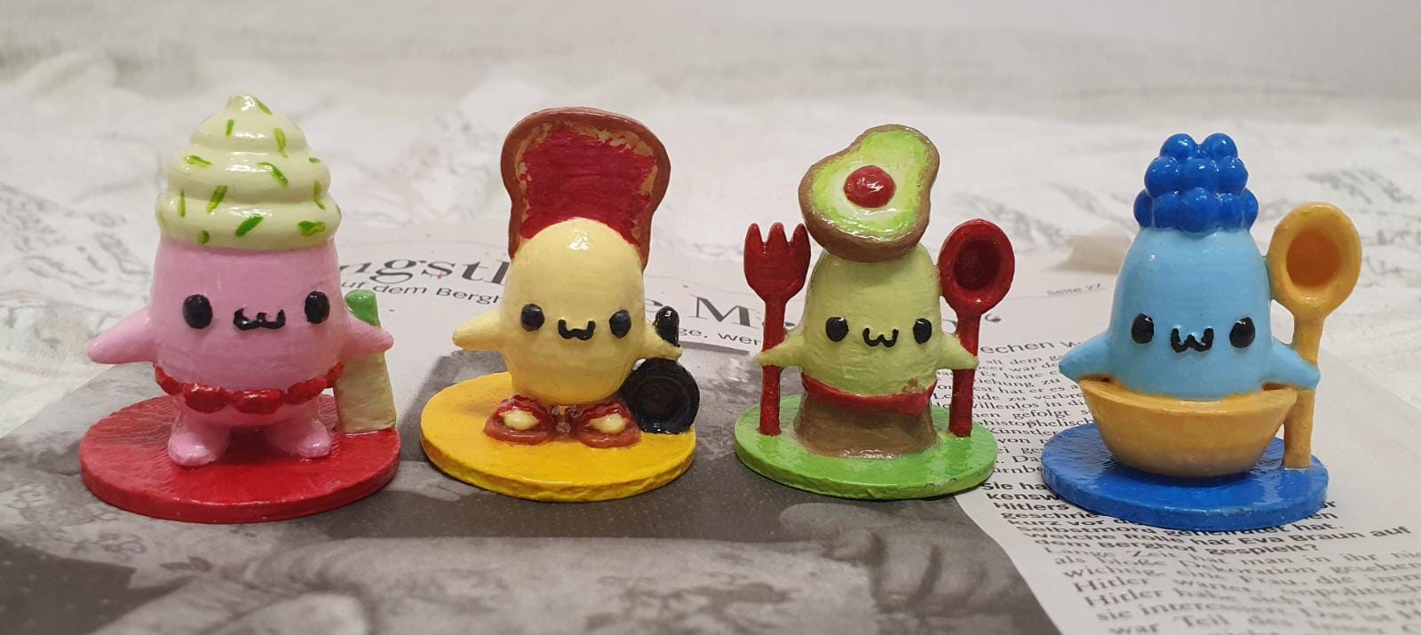 We came up with a design for the board game figures and after the sketches were made i used Blender to model them so that we could 3d print them out for the physical prototype of the game.AfterthefirsttestprintIhadtomake changestothemodels, thecenterofgravity ofthefigureshadtobetaken intoaccount sothattheywouldnotfallover. Alsothe thicknessoftheindividualparts, suchasthe panorthe spoon, hadtobereinforcedso thattheywouldnotbreakoffsoeasilywhen used. We also desired on how tall the figures should be compared to the board and how detailed we could go with the 3d printer.
