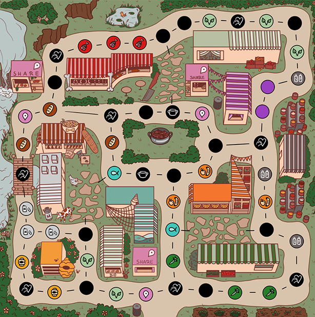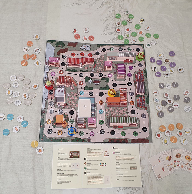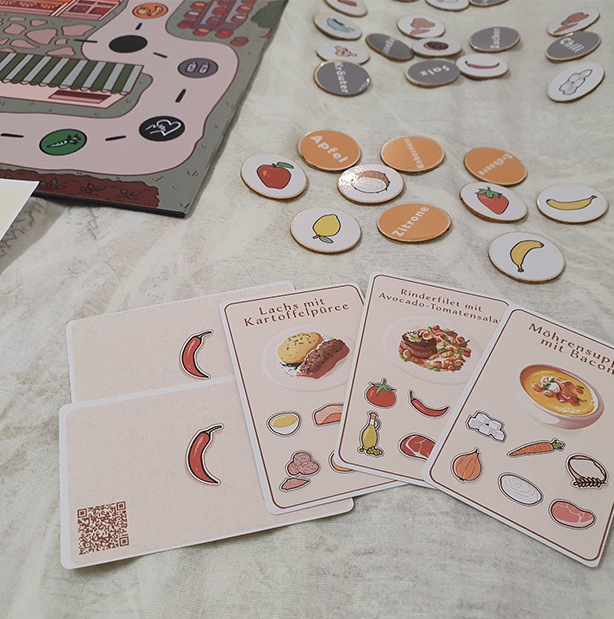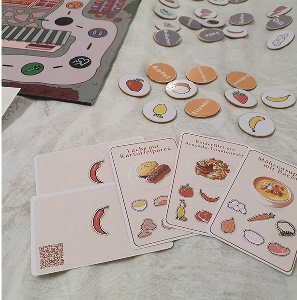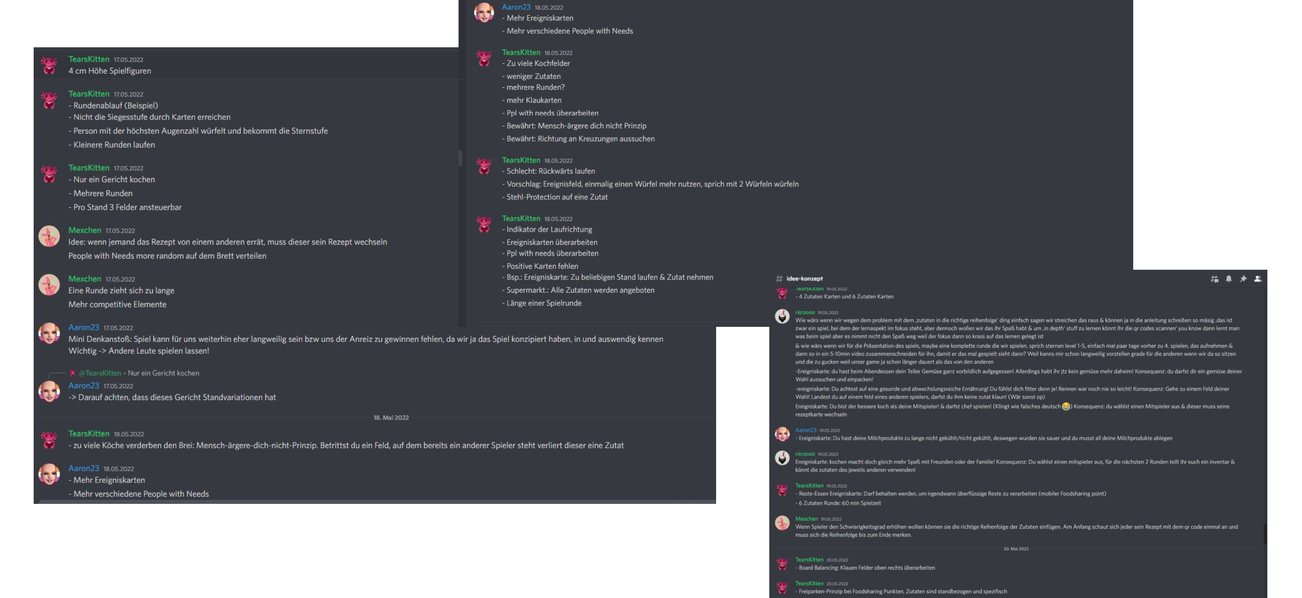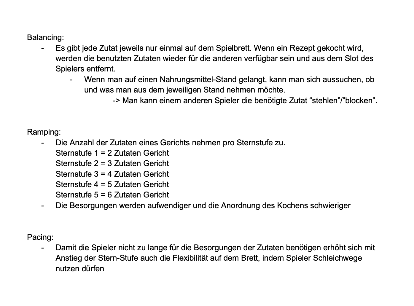 Fortestingwegottogetherinthegroup andstartedplayingtheboardgame. While playing, wewrotedownwhatwe noticed or what was unclear to us. Withthefirstversion, ittooktoolong andwasn‚treallyfun, sinceyoujusthadto runfromone standtotheothertogetyour ingredients. Afterthegamesessions, we sat down and discussed what improvements could be made to optimise the game experience and implemented the new ideas into the final game.